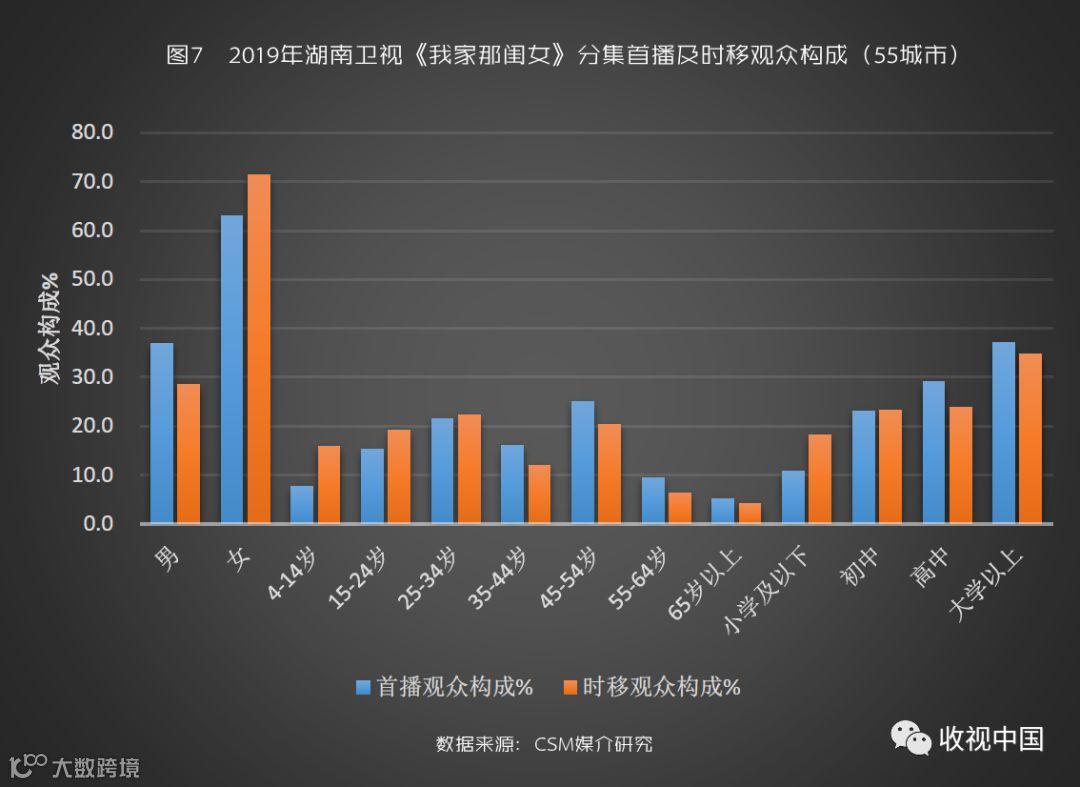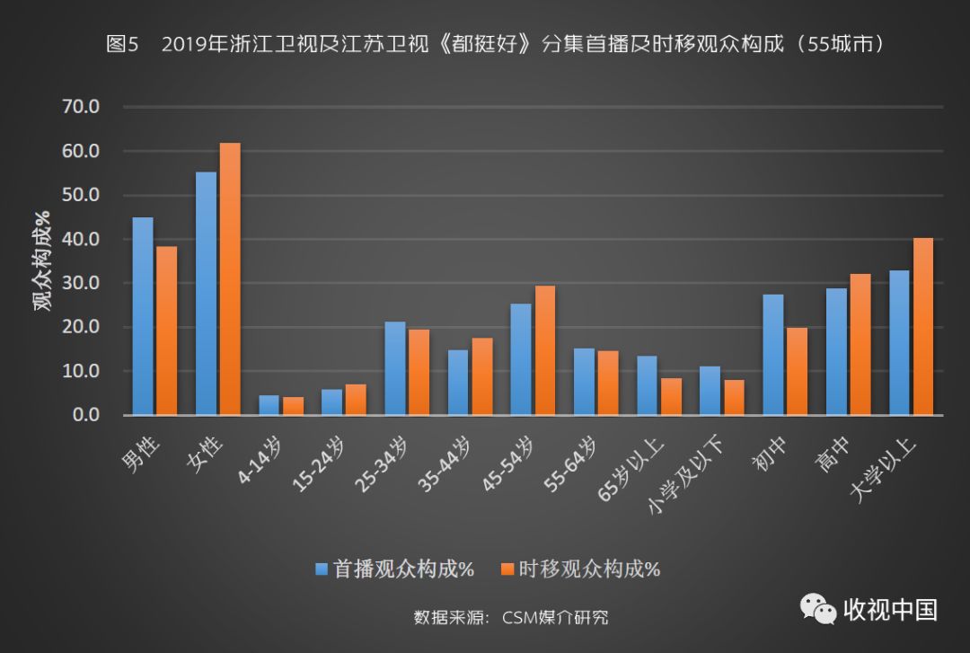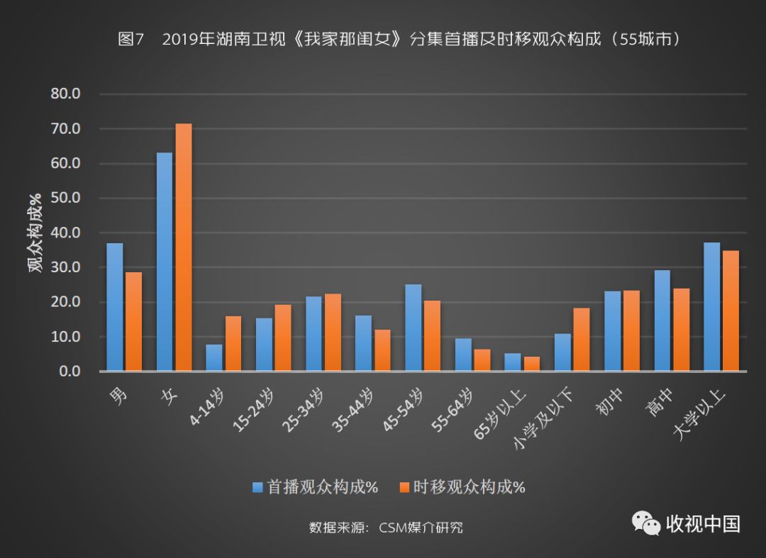 以2019年刚结束的《我家那闺女》为例,节目除本身自带话题性外,更重要的是节目注重回归现实语境。摄像机无处不在的存在于嘉宾家中的各个角落,真实的记录下她们每日的生活。没有多余的任务设置,只是简单地记录生活,可以说其虽为综艺节目,却拍出了纪录片的真,真实使节目代入感大大增强,观众通过明星的生活及其与父母的待际沟通问题使电视观众看到了自己与父母(或与子女)之间存在的实实在在的待际沟通问题,引发了广泛的社会共鸣。从收视表现来看,1月26日播出的“何炅徐海乔暖心献唱鼓励吴昕,傅园慧展运动员真实困境”为主题的一期节目在55中心城市的收视率最高,收视率达到1.02%,而1月19日播出的“吴昕徐海乔“约会”看中医,傅园慧首次独居生活状况多”为主题的这一期时移收视(0.69%)和总收视(1.58%)拔得了头筹(图6)。那么,是哪些受众对这档真实记录亲子关系的家风类综艺节目青睐有加呢?从性别构成来看,由于节目的主题是观察“闺女”的生活来探讨待际沟通,因而女性成为了该节目收视的绝对主力,数据显示,首播观众中,63%的观众为女性,时移观众中这一比例更是超过70%;从年龄层次来看,青少年、中青年受众的分布比较均衡,相对而言老年观众对节目关注度较低,这也反映出当前无论是子女还是父母都希望通过观看节目来增强待际沟通的现实愿望;从教育程度来看,中高学历观众占据绝对主体(图7)。笔者认为,随着越来越多接受过高等教育的“80后”“90后”为人父母,对于家庭文化、家风的重视会被提上新的高度,更多符合年轻人喜好的家风类节目将会展现自身的魅力。