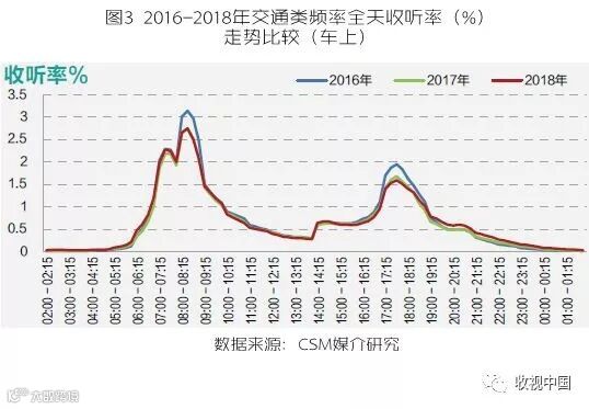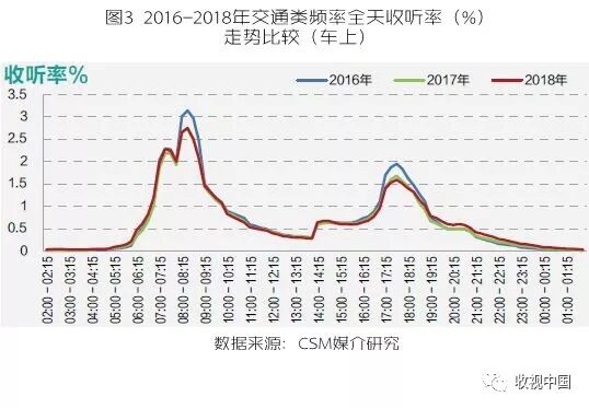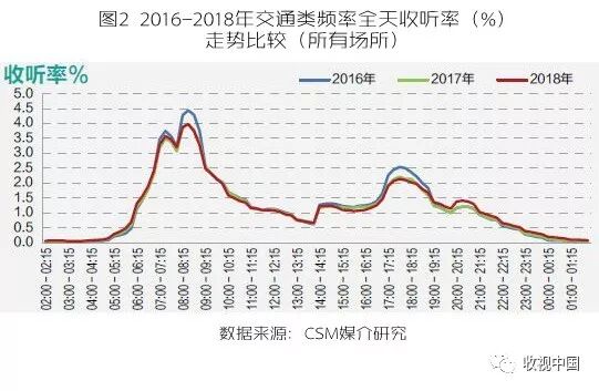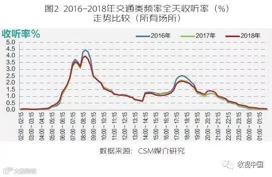 通过比较近三年交通类频率的全天收听率走势,在“所有场所”,全天收听率走势基本一致,早晚高峰均出现在早间07:00-09:00和晚间17:00-19:00,2018年早晚收听峰值与2017年基本持平,但较2016年有所下滑。2018年早高峰峰值与2017年相同,为3.98%,较2016年的4.44%下降了0.46个百分点;晚高峰峰值为2.14%,较2017年的2.21%略微下降0.07个百分点,较2016年的2.54%下降0.4个百分点。在其他时段中,2018年的收听率与前两年基本持平,无明显差异(图2)。