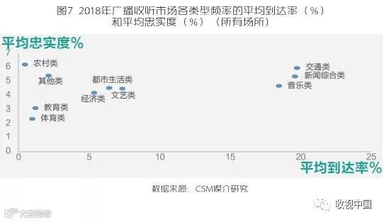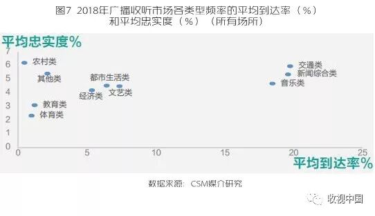 我们可以通过平均到达率和平均忠实度这两个维度来考量各类型频率的竞争力,平均到达率反映了听众收听的广度,即有多少不重复的听众收听该频率,平均忠实度反映了听众收听的深度,即听众有多长时间收听该频率而不转台。交通类、新闻综合类和音乐类频率依靠丰富的节目资源优势,吸引着大量的听众,被认为是拉动收听的三驾马车。我们可以看到在所有场所,交通类、新闻综合类和音乐类频率的平均到达率和平均忠实度都处在一个较高的水平上,为强势媒体平台,而农村类、文艺类、都市生活类和经济类频率的平均忠实度较高而平均到达率相对低一些,属于小众频率(图7)。