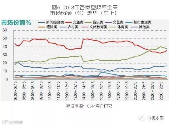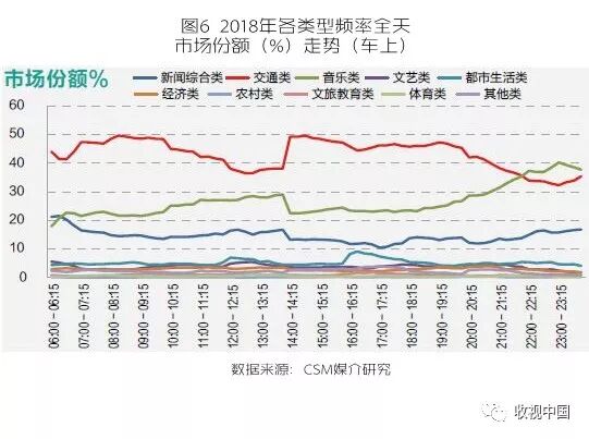 再看车载收听市场,2018年交通类频率的市场份额为45.31%,全天大部分时段都具有绝对的竞争优势,市场份额遥遥领先于其他各类型频率(图6)。随着晚高峰的结束,道路交通情况逐渐变好,交通类频率的收听开始逐渐下滑。与之相反,音乐类频率的收听走势从17:00晚高峰开始逐渐上升,到了夜间21:30-24:00时段与交通类频率形成了竞争态势。虽然夜间时段音乐类频率对交通类频率造成了一定的威胁,但由于交通类频率在全天大部分时段都有稳定的支撑,在车载收听市场的霸主地位不可撼动,仍然具有非常高的广告投放价值。
