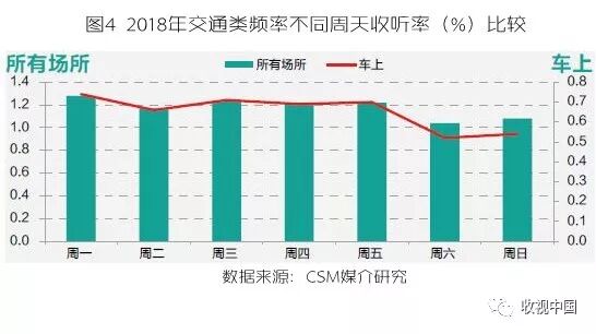 从不同周天交通类频率的收听表现来看,“所有场所”和“车上”的收听走势较为相似,并且两者工作日的收听表现均要高于周末(图4)。从图4中我们可以看出周一的收听率最高,是因为周一上班时段的路况在一周之中最为复杂,在周二收听率会有下滑,随后周三出现回升并在周四和周五趋于平稳。到了周末,大部分听众都处在休息状态,这时他们在收听选择上会出现一些变化,导致交通类频率收听率较工作日有所降低,进一步来看,周末车上收听率下降的幅度比起所有场所要更大。由此可见,交通类频率的收听表现一定程度上会受到听众作息时间的影响,并且车上收听受到的影响会更大。