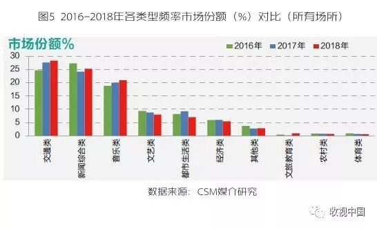 在所有场所各类型频率的收听竞争中,交通类、新闻综合类和音乐类依旧保持着较强的竞争力。2018年交通类频率的市场份额继续提升呈现逐年上升的趋势,从2016年的24.66%上升至2017年的27.60%直至2018年的28.34%,保持第一的位置。新闻综合类频率的市场份额出现了回升的态势,从2016年的27.30%下滑至2017年的24.15%又回升到2018年的25.29%。文艺类、都市生活类和经济类频率的竞争力相对较弱,2018年市场份额分别为7.99%、7.04%和5.45%。体育类、农村类和文旅教育类 因为受频率定位、节目内容等限制,受众范围较小,市场份额相对较低(图5)。