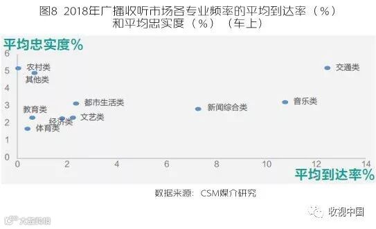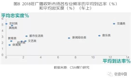 在车载收听市场,交通类频率以高平均到达率和高平均忠实度,稳稳地位居强势媒体平台区域内。此外,音乐类频率和新闻综合类频率虽然也有一定的竞争力,但相较于交通类频率无论是平均到达率还是平均忠实度都还有较大的差距。拥有高而稳定的听众收听深度和听众收听广度,是交通类频率在车载收听市场拥有巨大竞争优势的主要原因(图8)。