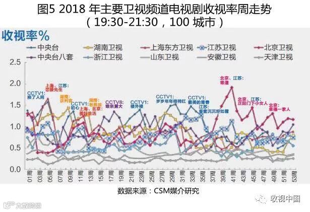 资源争夺战体现在收视走势上立竿见影,然而缺乏现象级大剧也导致竞争层次无法大幅度拉开,因而2018年主要卫视收视率走势比2017年显得更为胶着。开年大戏中,中央台一套的《换了人间》表现较好;1月12日上海、江苏联手播出的《恋爱先生》总收视率高达2.34%,是第一季度收视最好的电视剧;2月湖南、中央一套、上海/北京的剧目竞争激烈,湖南卫视《谈判官》、中央台一套《初心》在同期较量中脱颖而出,2月底北京、上海俩卫视联播的《美好生活》成为第二部总收视率破2%的剧目;3-4月几部联播剧《好久不见》《下一站别离》《真爱的谎言之破冰者》收视不错,中央台八套的《娘亲舅大》表现突出;5-6月,北京/上海俩卫视联袂推出《归去来》《脱身》,总收视率均不低于1.5%,而中央台一套的《楼外楼》和中央台八套的《灵与肉》分别与前两部剧同期打擂台,效果良好,单频道收视率双双破1%;暑期,湖南卫视提前布局,6月25日开播轻喜言情剧《一千零一夜》,7月23日又推出流量剧《甜蜜暴击》,走出一波好行情。而其他卫视迎战暑期的意味并不浓,反而显得中规中矩。7月初,中央台一套播出农村剧《岁岁年年柿柿红》,同期上海、江苏推出涉案剧《猎毒人》,北京卫视播出谍战剧《面具》,收视抢眼。8月初中央台一套推出励志题材《最美的青春》,同期江苏卫视破冰独播古装剧《香蜜沉沉烬如霜》,喜获1.19%的收视率,豆瓣评分7.8,流量破百亿,罕见实现了收视流量和口碑的三统一,也成为暑期代表作之一;第四季度是改革开放四十周年的节点,上映的14部献礼剧占了全年一半,然而收视亮点却不多,其中《大江大河》表现最好;9月起北京卫视以每月一部的频率推出《娘道》《正阳门下小女人》《幸福一家人》《大江大河》等热门剧,收视率开挂一般齐齐破1%,走势高扬,将其他卫视远抛身后,从而圆满实现竞争突围。以此观之,卫视破局之路“部部惊心”,每一部都马虎不得(图5)。