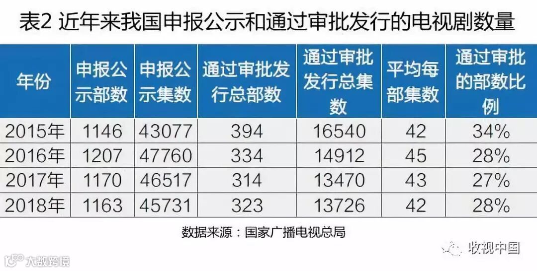 政府持续严控生产源头,继续“挤泡沫、去虚火”。一方面控制过审总量,近年来我国电视剧总集数申请量处于下滑通道,2018年全年全国生产完成并获得《国产电视剧发行许可证》的剧目是323部13726集,尽管较之2017年略有增长,但过审率已连续三年不足1/3。另一方面则控制电视剧注水行为,杜绝无节制拉长剧集长度,2018年通过审批的平均集数是42集,同比2017年减少了1集,比2016年减少了3集。这些信号一定程度上说明近两年电视剧市场虚热局面已有所扭转,效果显著,步入理性发展轨道(表2)。
