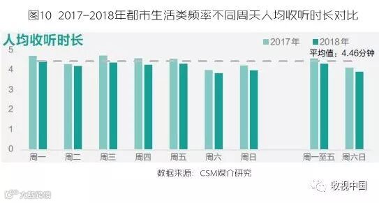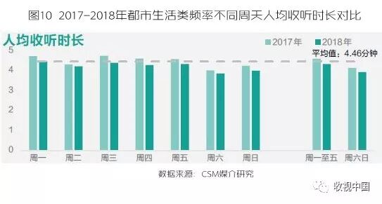 从不同周天都市生活类频率的人均收听时长变化上看,工作日中周一和周三的收听时长较高,周二、周四、周五的收听时长相对较低一些;周六日整体收听时长要低于工作日,周六为一周内收听量最低(图10)。
