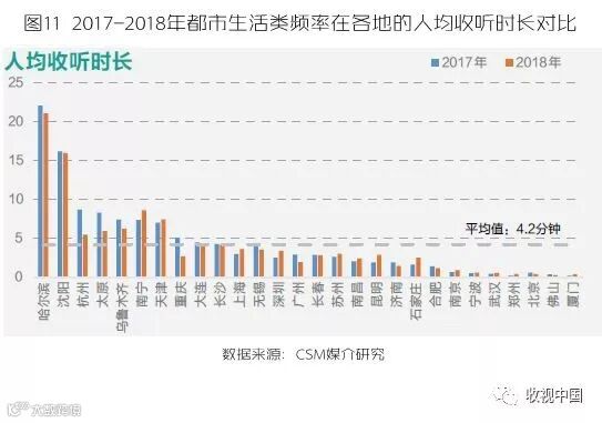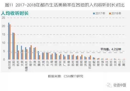 从各地收听都市生活类频率人均收听时长上看,2018年该类频率在全国不同城市的收听水平差异较大,全国平均值为4.2分钟,有9个城市超过该平均值,大部分地区的人均收听时长低于平均水平。从两年的对比上看,都市生活类频率的人均收听时长在南宁、天津、深圳等12个城市的时长有增长,其他城市对比2017年则有下滑(图11)。