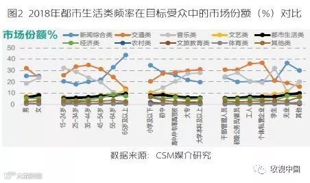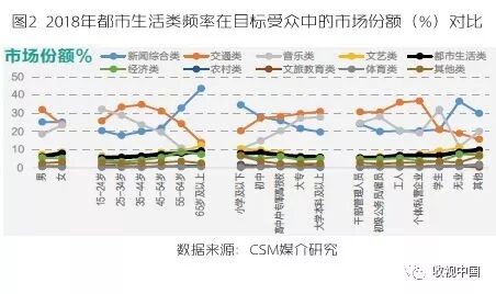 2、都市生活类频率在各目标人群中竞争力与文艺类频率相当,在女性、45岁及以上听众中份额较高