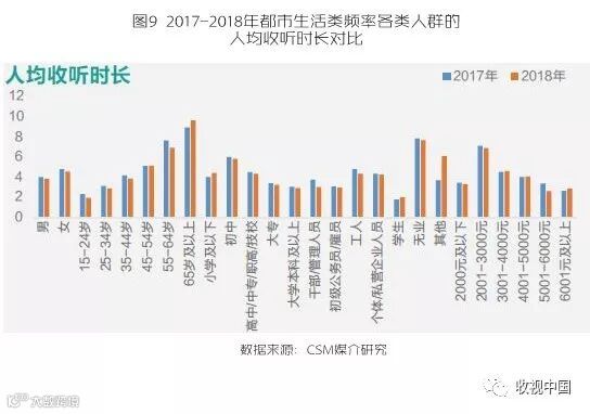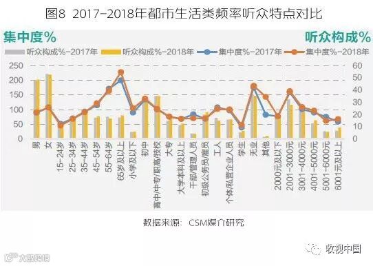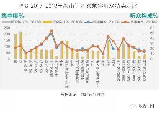2017-2018年都市生活类频率的听众特点变化不大,主要重度听众为女性、45岁及以上、中等教育水平、工人、个体/私营企业人员、无业、其他职业和个人月收入在2001-3000元的人群(图8)。