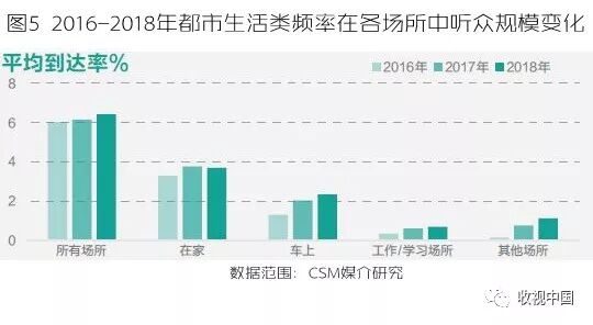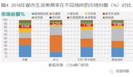 对比各类频率在2018年各主要场所的份额来看,都市生活类频率在家的竞争力最强,整体为8.54%,要高于频率所有场所的平均份额水平;在车上的份额相对最弱,主要受交通类频率在车上场所表现强势的影响;在工作/学习场所中,都市生活类频率的份额也要优于整体平均水平,与文艺类频率相当。在其他场所中则与文艺类、经济类频率的水平相当(图4)。