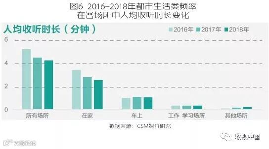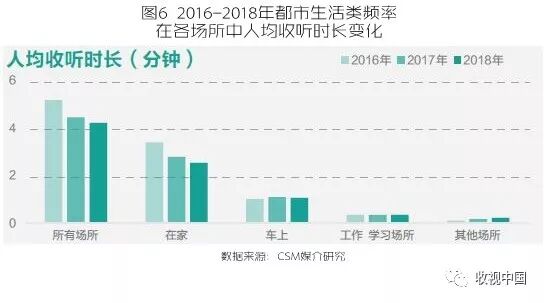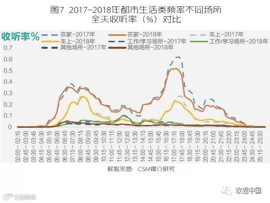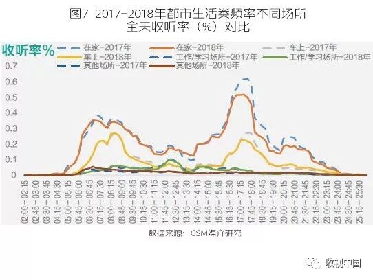 从全天收听时段变化上看,2017-2018年都市生活类频率在家场所中跌幅较大的时段为16:30-21:00,其中下午收听高峰跌幅较明显,其余时段基本维稳;车上17:30-18:30的跌幅较大,其他时段稳定。工作/学习场所全天收听率走势与去年基本一致,其他场所中在清晨时段有所提升,其余时段收听率维稳(图7)。