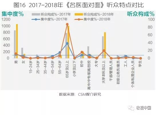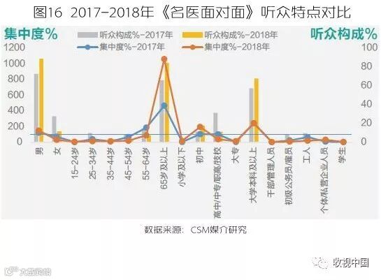 节目打造的公益品牌活动“大爱有声·爱心伴你行,百位名医进社区”公益行动,举办场次接近两百场。通过走进校园、社区、图书馆甚至水上巴士,把名医服务送到百姓身边。节目经过多年的品牌培育,吸引一大批忠实的听众,男性、55岁及以上的中老年听众对节目的集中度很高,也吸引大学本科及以上教育水平的听众收听(图16)。