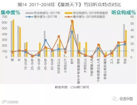 《漫游天下》节目听众群随着节目的变化也有一定改变,不仅保持45岁及以上重度听众的稳定,2018年对15-24岁年轻受众的吸引力也逐步增加,从职业类别上看,对个体/私营企业人员和学生、无业人群的吸引力也较高(图14)。