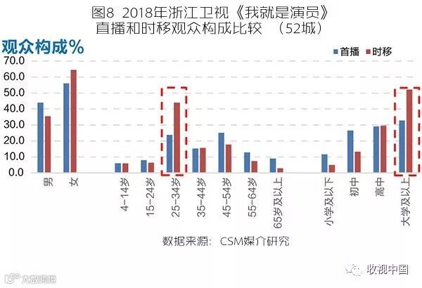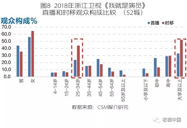 伴随着消费场景、沟通场景、生活场景的多样化,传统电视观众带来的红利逐渐衰减。具有各自社会属性的观众在时间和空间上的角色转化,其个人情感和文化消费行为需求被碎片化了,而这些变化可以在家中的电视屏幕前通过“电视的N种看法”进行无缝对接,所以通过线性直播获得的观众弥足珍贵,主动选择点播、回看的观众也不能放弃。相比之下,愈加垂直细分的各式综艺节目更能通过切中“小众”喜好,有效实现直播观众和时移观众互补合流,最终展现节目内容的多重价值。比如浙江卫视9月8日开播的演技竞演类励志综艺节目《我就是演员》,周六20:15首播时间的观众构成与截至2018年12月的时移观众构成有较大的差异,在时移观众中,25-34岁和大学及以上学历的观众的收视贡献尤为明显。这当然也与节目首播选在周六20:15播出有关,周末相对有更多的空闲时间可以自由选择点播、回看功能,这为高学历年轻人增加了很多收看的机会。另外,还有一部分观众因为更爱其中的某一期而重复地多次点播、回看。直播观众和时移观众形成互补,除了节目中植入的广告以外,直播中插广告和点播、回看中的广告完全可以触达两个不同人群,从而为节目的内容价值多重赋能(图8)。