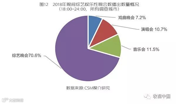 尽管垂直细分是时下综艺节目流行的获取观众兴趣的方向,但从2018年71城市晚间黄金时段播出的非常态新节目来看,非节庆性的庆典/颁奖/晚会和节庆假日特别节目数量仍占了一半以上的比例(图11)。由于大型晚会具有广泛的群众基础,老少皆宜,所以作为区别于常态综艺节目形式,综艺娱乐性晚会是综艺市场的主要支撑力量。如果仅以节目名称作为区分标准,并且多频道同一名称的晚会算一台晚会,那么2018年所有调查城市各级频道在晚间18:00-24:00时段播出的综艺娱乐性晚会总共也有756台,有714个频道参与其中,累计共有75.3%的城市观众收看过。这些娱乐性晚会涉及综艺晚会、戏曲晚会、演唱会和音乐会多种形式 ,其中综艺晚会数量占了七成以上的比例(图12)。