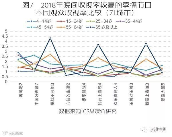 受碎片化娱乐需求影响,综艺节目观赏需求进一步细分。在此背景下,一批主打“小而精”的垂直类电视节目应运而生,从文化、家装、美食、亲子、相声选秀、足球解说等题材入手,力求将创新着力点深入到更为精准的垂直领域。面对特定观众的节目如果找到其相对稳定的需求特征,就会催生更多的节目投入到这个更加个性化的市场,虽然收视率不一定高,广告收益也不一定大,但因为更加差异化,更精准的人群,更细腻的表达,反而能充分满足需求,赢得稳定且具有特质的受众关注。2018年晚间收视率排名前十的季播节目的不同年龄段观众收视率显示,观众的个人需求愈加复杂,每个人身上都可能存在多种需求,对节目的喜好也是会随着个人行为轨迹而纵横交错(图7)。