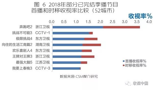 从创新路径来看,2018年综艺节目在节目的人物关系和场景变化中或多或少的开始使用加法和减法,从而让观众对节目产生新期待,延长节目的生命周期。《中国好声音》《歌手》这样走过多季的综N代节目已经渐渐大众熟悉,观众审美疲劳和外部同质竞争势必带来一定的观众分流。为了维持自身生命力,无论在嘉宾选手阵容,还是在赛制环节设计上,都在“量体裁衣”地进行加减法调整。比如2018年4月开播的《奔跑吧2》,采用主题模式,在设置上加入更具有时代感和地区意义的主线,如第一期在联合国维也纳总部和奥地利国家旅游局的支持下,来到联合国的维也纳总部进行学习访问。另外,节目也在竞技设计中简化环节规则,如在第七期百人拔旗障碍赛中不仅在强风机前挑战吃面与跳远,还和工友们比赛砸钉子,游戏比拼通俗易懂易执行。《奔跑吧2》全季首播和时移的总收视率是3.6%,时移收视率和首播收视率的比率就算在时移收视率较高的《极限挑战4》《向往的生活江南篇2》《王牌对王牌3》等已持续开播多季的节目中也是较高的,说明“综N代”节目虽然有审美疲劳,但只要顺应目标观众做出相应的加减调整,仍会获得持续关注(图6)。