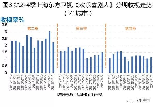 当然,已经举办了四季的《欢乐喜剧人》也在这一季中集中暴露了一些问题,喜剧人创作的时间周期太过密集,虽然前三季也是如此,但各家团队毕竟“存货”较多,经过了四年,在固定壳子里可供选择的内容已经被消耗的差不多了,喜剧节目的轮番透支,每一家喜剧人的喜剧模式观众早已烂熟于心。从分季收视走势也可以看出,第二季之后,《欢乐喜剧人》的收视水平逐渐走低,第三季与第四季走势大致相似,趋于平稳(图3)。