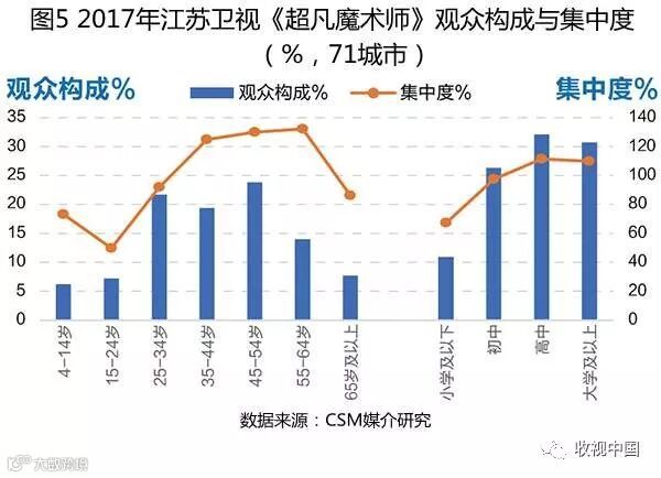 从节目的观众构成与集中度中可以看出,江苏卫视《超凡魔术师》拥有较为广泛的观众基础,25-54岁的中青年观众是绝对的主体(图5)。