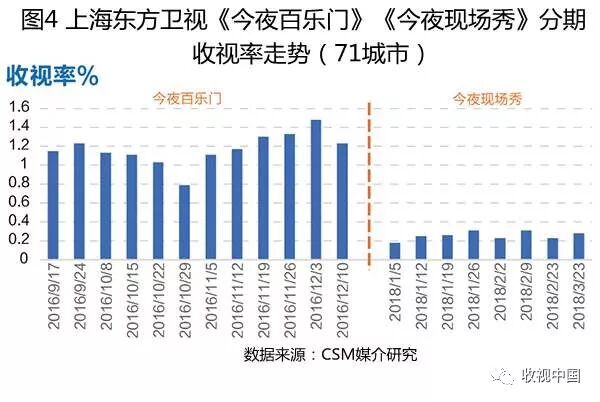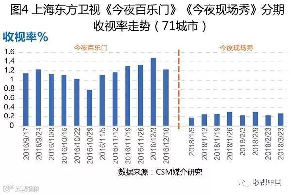 2018年,《今夜百乐门》节目更名为《今夜现场秀》,由于金星以及诸多卡司的退出,更名后的《今夜百乐门》相较于第一季大打折扣,节目体量缩减,小品质量下降,场景喜剧的内核逐渐丢失。收视反馈也不甚理想(图4)。当然,节目质量的下滑与政策的变化可能也有一定的关系,随着我们国家相关机构对于综艺节目的管控日趋严格,单纯搞笑的喜剧节 目受到了较为明显的冲击。同样是在2018年,优酷原版引进了国外版权,推出了一档纯网综艺,中国版《SNL周六夜现场》,精准定位广大年轻受众,将国际化的节目模式和中国当代年轻人的真实故事相结合,以都市化、年轻化的姿态,与国际化接轨。