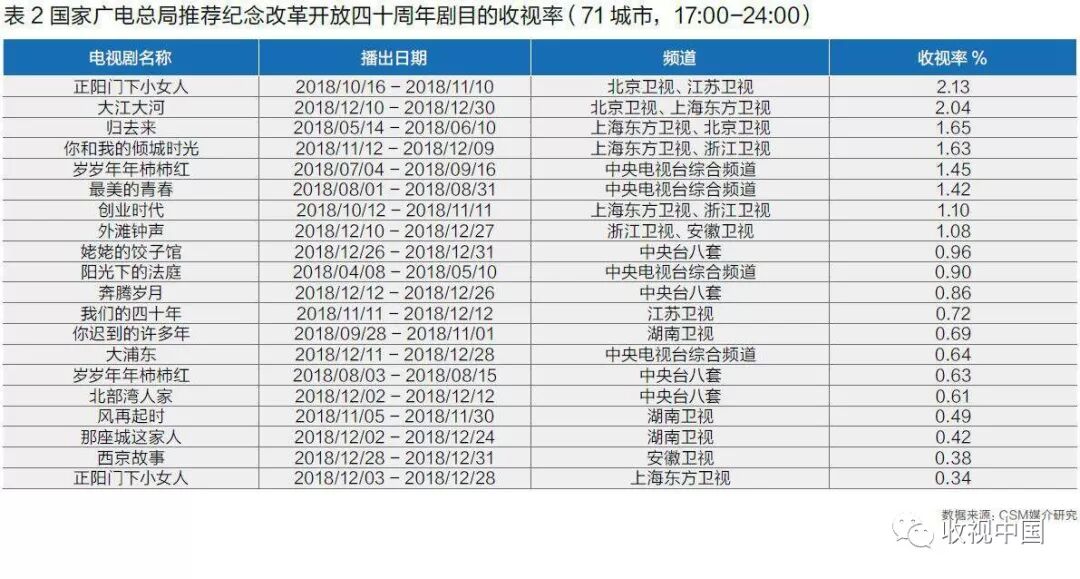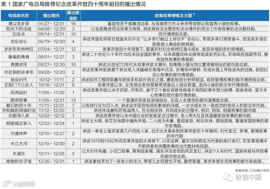 除非特别说明,文中涉及的改革开放节目均为相关行业主管部门推荐或者节目宣传口径和定义的纪念改革开放四十周年节目或者冠名“改革”、“开放”、“四十周年”、“改革开放四十周年”及“改革开放40周年”等字眼的节目,节目类型主要包括电视剧、专题、综艺、音乐和新闻/时事等。节目播出时间段范围为08:00-24:00,目标观众为四岁及以上所有电视人口。