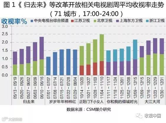 从《归去来》等收视率相对较高的五部改革开放相关电视剧周平均收视率来看,这五部剧的收视率均表现出明显的逐周走高的态势,体现了71城市观众对这五部剧的高度认同。(图1)