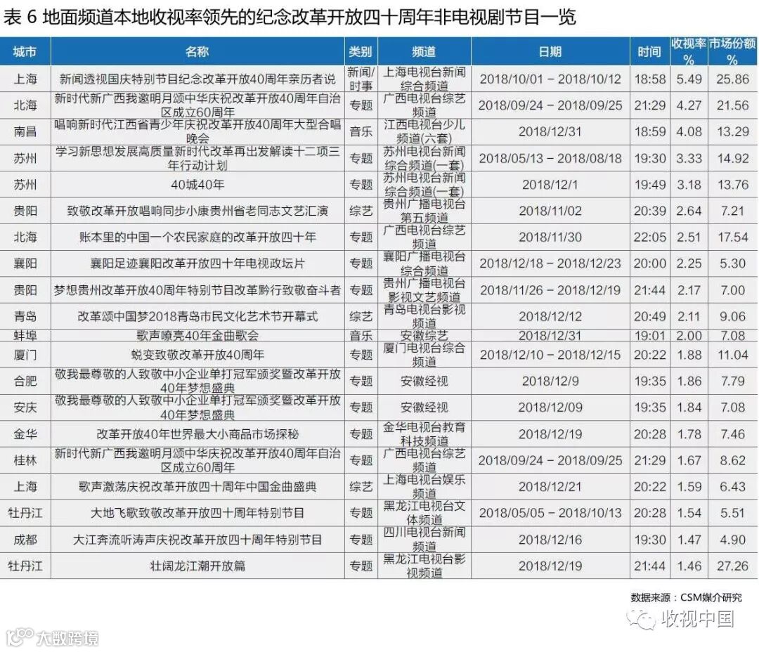 与上星频道播出的改革开放相关节目相比,各地地面频道播出的改革开放相关节目,表现出明显的形式多样性和内容贴近性。上海电视台新闻综合频道播出的《新闻透视国庆特别节目纪念改革开放40周年亲历者说》在上海的收视率为5.49%,市场份额为25.86%;广西电视台综艺频道播出的《新时代新广西我邀明月颂中华庆祝改革开放40周年自治区成立60周年》在南宁的收视率为4.27%;江西电视台少儿频道(六套)播出的《唱响新时代江西省青少年庆祝改革开放40周年大型合唱晚会》在南昌的收视率为4.08%,这三档节目成为地面频道中令人瞩目的改革开放相关的节目。(表6)
