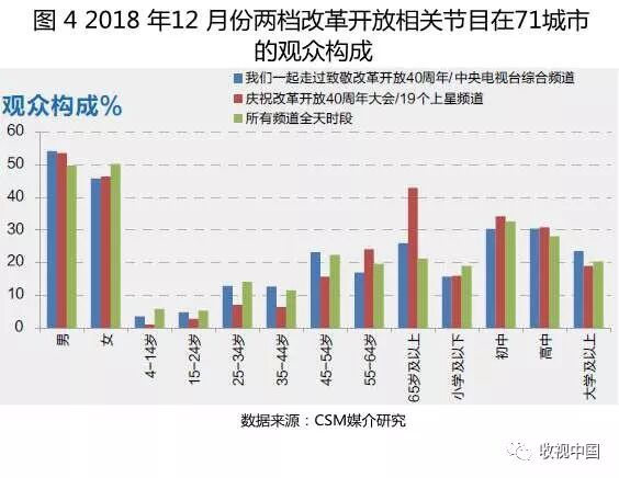 上海电视台新闻综合频道播出的《新闻透视国庆特别节目纪念改革开放40周年亲历者说》是一档新闻/时事类节目,其观众中45岁及以上(81.01%)和高中及以上学历(61.97%)观众占比较高。广西电视台综艺频道播出的《新时代新广西我邀明月颂中华庆祝改革开放40周年自治区成立60周年》是一档专题节目,其观众中男性(64.42%)、45岁及以上(67.36%)和中等学历(65.84%)观众占比较高。江西电视台少儿频道(六套)播出的《唱响新时代江西省青少年庆祝改革开放40周年大型合唱晚会》是一档合唱晚会节目,其观众中,15-34岁(56.26%)和高中及以上学历(64.90%)观众占比较高。(图5)