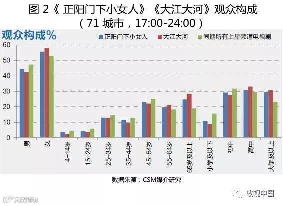作为广电总局推荐的改革开放相关剧目,《正阳门下小女人》是一部讲述改革开放以来,女性创业者徐慧真带领身边人创业致富、走向小康的励志年代情感剧;《大江大河》是一部讲述改革开放的大背景下,以宋运辉、雷东宝和杨巡为代表的先行者们在变革浪潮中不断探索和突围故事的当代题材电视剧。这两部剧在71城市表现出高度相似的观众构成特征,两剧观众中,女性、25-34岁、45岁及以上和高中及以上学历观众占比较高,相比于所有上星频道电视剧观众构成,《正阳门下小女人》和《大江大河》高中及以上学历观众占比更高。(图2)