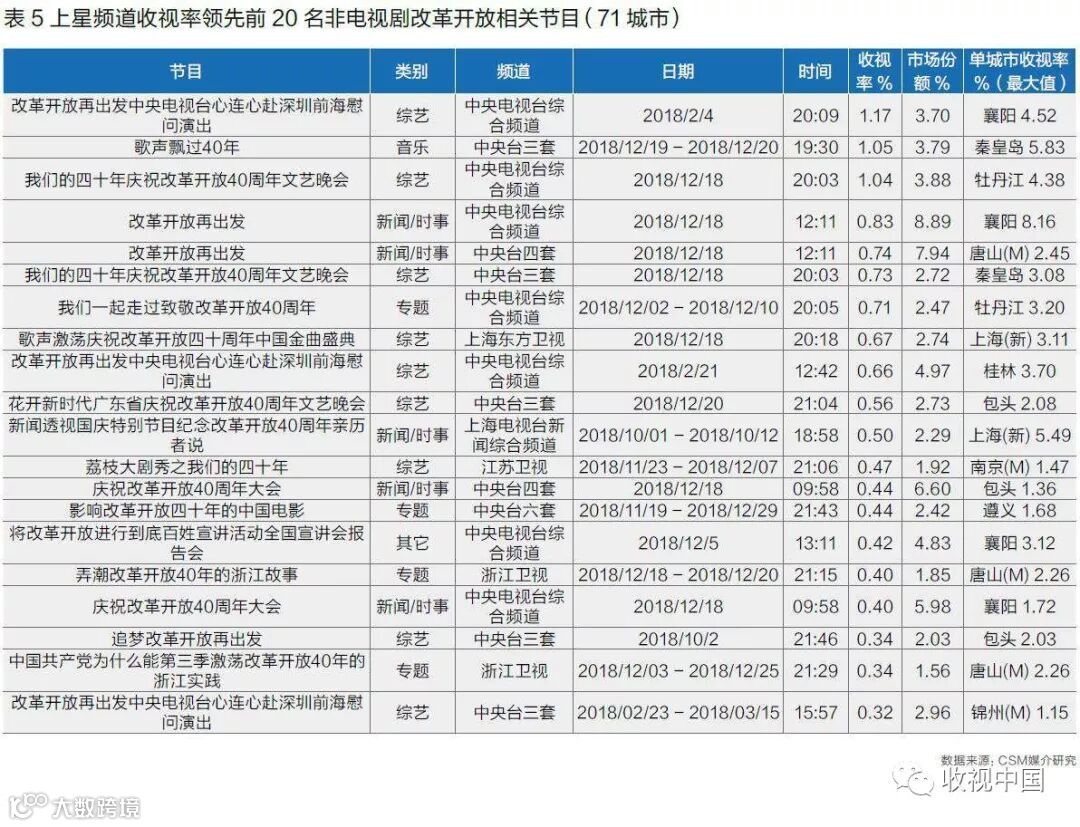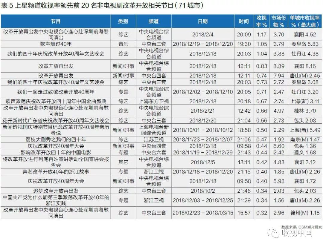 从上星频道播出的改革开放相关节目的收视情况来看,中央电视台综合频道2月4日播出的《改革开放再出发中央电视台心连心赴深圳前海慰问演出》在71城市组合的收视率为1.17%,其单城市收视率最大值出现在襄阳,为4.52%。中央台三套的《歌声飘过40年》71城市收视率为1.05%,其单城市收视率最大值出现在秦皇岛,为5.83%。中央台综合频道的《我们的四十年庆祝改革开放40周年文艺晚会》71城市收视率为1.04%,其单城市收视率最大值出现在牡丹江,为4.38%。(表5)