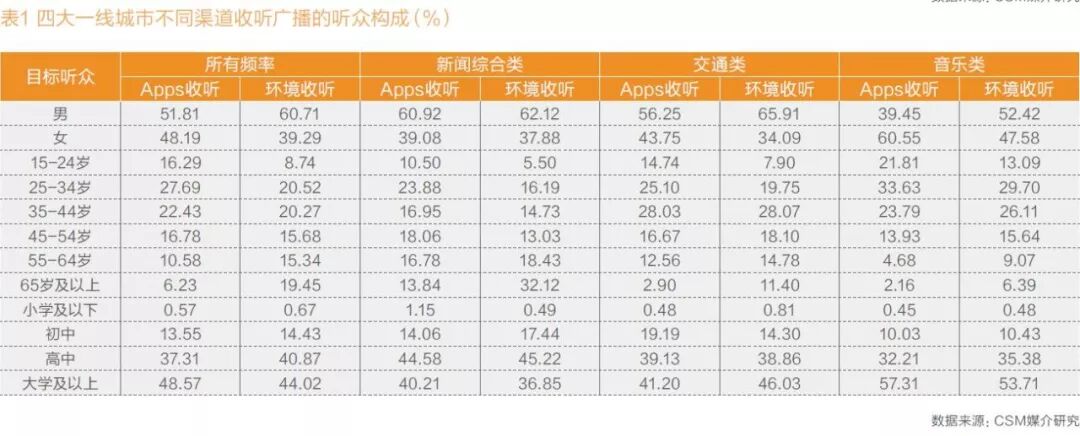 除了不同收听场所将听众群体区隔开外,使用移动互联网(手机APP)收听和传统电波传输(FM/AM)收听的群体也有较大区别。CSM媒介研究在包括四大一线城市中使用了最先进的手机虚拟测量仪调查方法,实时将收听渠道纳入到新的测量体系中。数据显示,2018年第四季度,四大一线城市中,使用手机APP收听和收听环境音(FM/AM)的收听总量相差无几。但是听众群体却有较大差别,尤其渗透到不同频率上,差异明显。数据显示收听传统直播流广播的男性比例远高于女性;除音乐类频率外,新闻和交通类频率使用APP收听的男性也大幅度高于女性;15-44岁的中青年使用APP的比例高达66.4%,而收听环境音(FM/AM)则不足一半;受过大学及以上教育的听众更多使用APP收听广播。45岁以上的中老年听众使用收音机收听新闻广播达到63.6%,同样的人群使用APP不足一半。交通类频率的主力人群,25-54岁的听众群中,两者差距较小,都超过65%,不足70%;收听音乐类频率的听众主要集中在15-44岁人群中,使用APP收听占近80%,收听环境音的比例为68.9%(表1)。