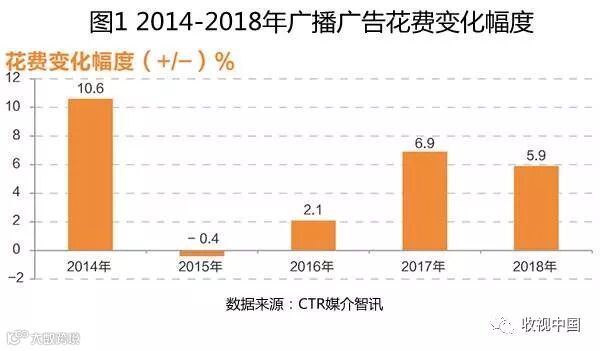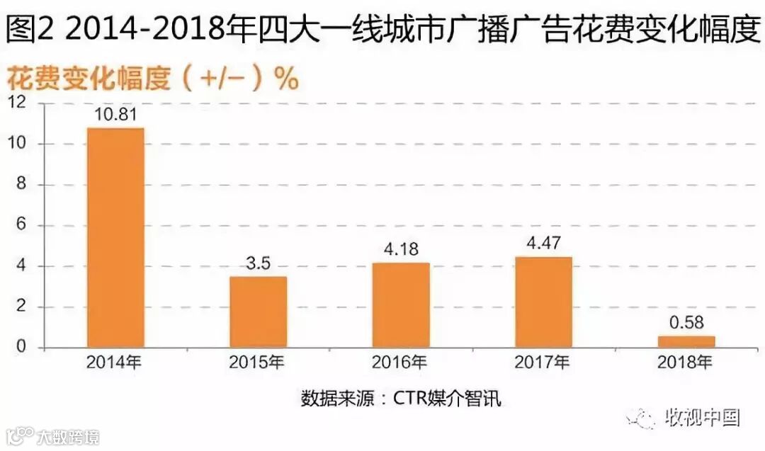北上广深四大一线城市向来人口规模大,高端人群多,GDP增速和整体总量规模遥遥领先,高消费、高品质、高标准生活是一线消费者所追求的生活形态。因此广告承载能力和投放成本也在不断提升,反映在电台广告领域中,过去五年来是品牌硬广告不断增加,医药保健品广告几乎绝迹的五年,整体广告花费增长幅度一直保持正向区间,但是2018年的增幅已经颇显疲态(图2)。