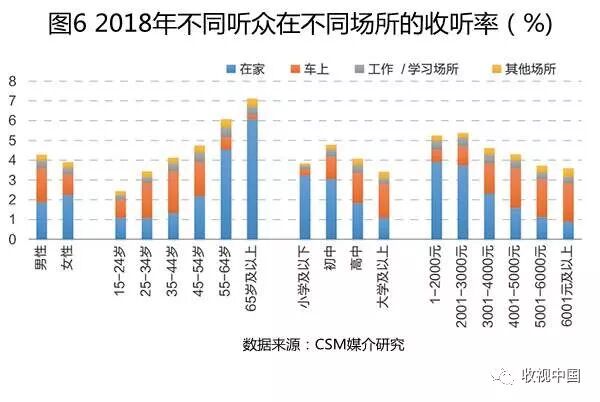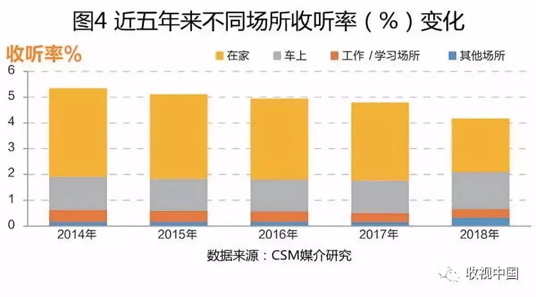 CSM媒介研究的收听率数据显示:在过去的五年中,城市整体收听市场不断缩水,总量在下降,但是分析其中的结构就会发现,下降主要来自居家收听,而以车载为首的伴随性收听的市场不但稳定且有上升的趋势,尤其是2018年,这一趋势更加明显,这为广告投放带来了利好的营收环境(图4)。