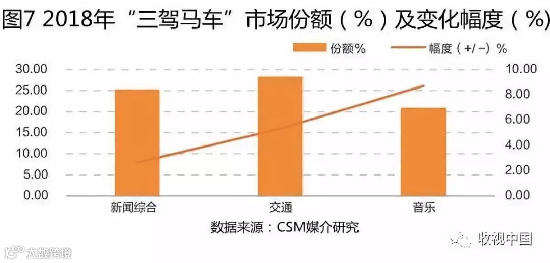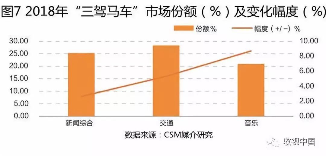 广播直播流领域一直以来都是新闻综合、交通和音乐三大类频率拉动整体的收听市场。2018年CSM媒介研究的全国城市收听数据显示:“三驾马车”总体占据收听市场75%的份额。但是近些年来,随着交通类和音乐类频率的强势上升,收听格局产生了变化,原来一直是新闻综合类频率占据头部位置,2018年CSM媒介研究的收听数据显示,交通类频率已经超越新闻综合类频率位居首位,而音乐类频率则成为增长幅度最大的频率类型(图7)。