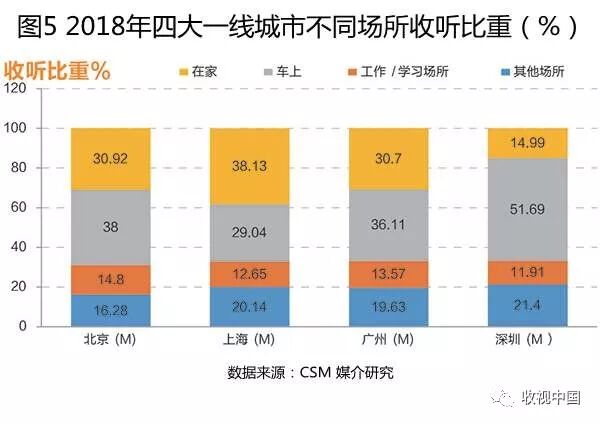 由于CSM媒介研究目前采用了最先进的智能手机虚拟测量仪方式,北上广深四大一线城市整体的收听率结果更加彰显了广播这种个性化,伴随性、移动性特征。居家收听总量占整体总量的比重越来越低,而非居家收听总量的比重越来越高,其中,车载收听已经超过家中(上海除外),成为最大的广播传播市场,与此同时,“其他场所”的收听增长成为亮眼的部分(图5)。