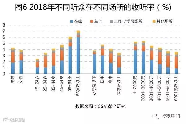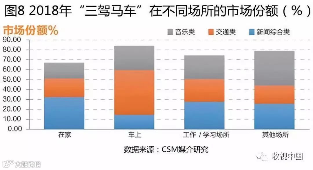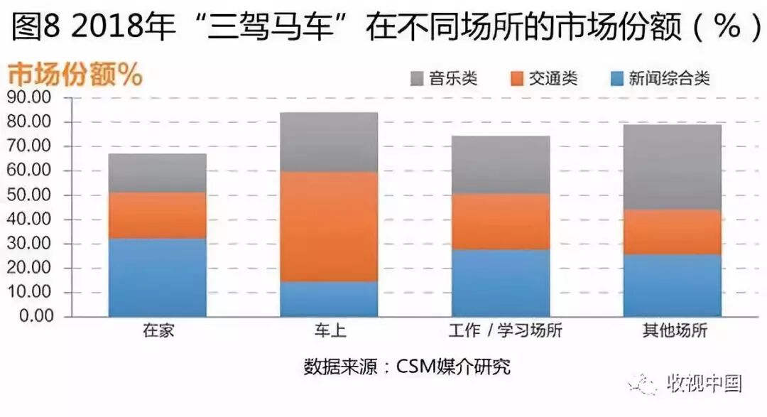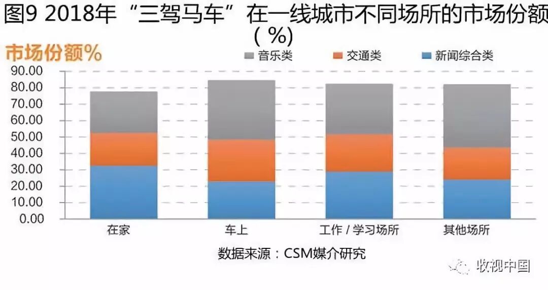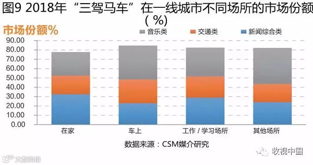 2018年,新闻综合类频率只有在“家中”收听占据主导地位,交通类频率在“车载”收听市场的份额超过45%,而音乐类频率则在工作/学习场所、其他场所表现更加出色(图8)。