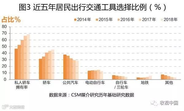 CSM媒介研究的基础研究数据显示:2014年,城市居民出行的第一选择方式主要是公交系统,到2016年,私家车出行已经超越公交车出行,五年后的2018年私家车出行已成为首选,相较五年前涨幅达45%,而选择公交车出行跌落至私家车的62%,仅仅占六成多。换言之,这五年中,私家车与公交车的出行选择此起彼落的变化影像了中国城市出行进入“以私家车为本”的高速增长期。可以预见,在今后相当长的一段时期内,选择私家车出行将成为城市出行的主流(图3)。
