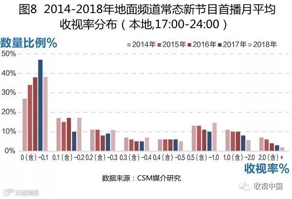在整体收视市场竞争中优势不断旁落的地面频道,在节目创新中的压力也日益增大。2018年晚间时段,地面频道播出的常态新节目中,首播月在本地收视率达到1%及以上的节目数量较前五年进一步萎缩,所占比例仅为8%。但收视率在0.5%-1%之间的常态新节目比例明显增长,达到14%。2017年到2018年,收视率在0.1%以下的低收视常态新节目比例也出现下滑,由47%降至38%(图8)。