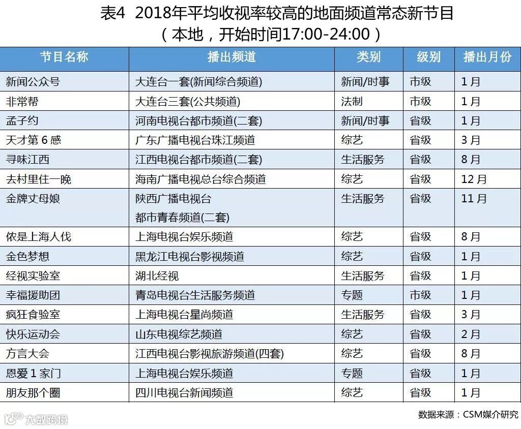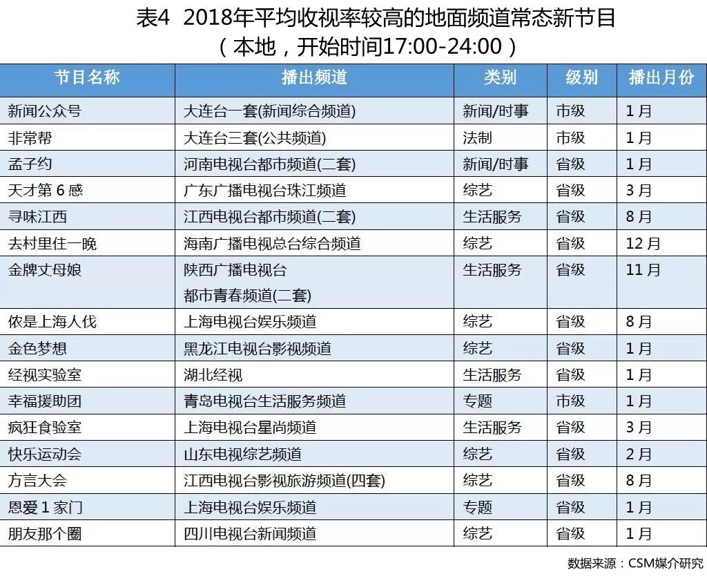 具体观察2018年晚间时段地面频道首播月平均收视较高的常态新节目,我们可以发现以区域文化为核心的民生娱乐、以本土生活为核心的民生服务和在地面频道长盛不衰的民生新闻仍然是节目创新最易取得收视突破的三大领域,以此为思路进行的节目创新更易获得本土观众的青睐。在收视较高的节目中,除了两档新闻类节目(《新闻公众号》《孟子约》)和一档法制类节目(《非常帮》)外,像《天才第6感》《去村里住一晚》《侬是上海人伐》等地域特色鲜明的综艺节目,以及《寻味江西》《金牌丈母娘》《经视实验室》等以提升本土受众生活质量为己任的民生服务类节目,在数量上更多,成为地面频道节目创新中的收视引领(表4)。