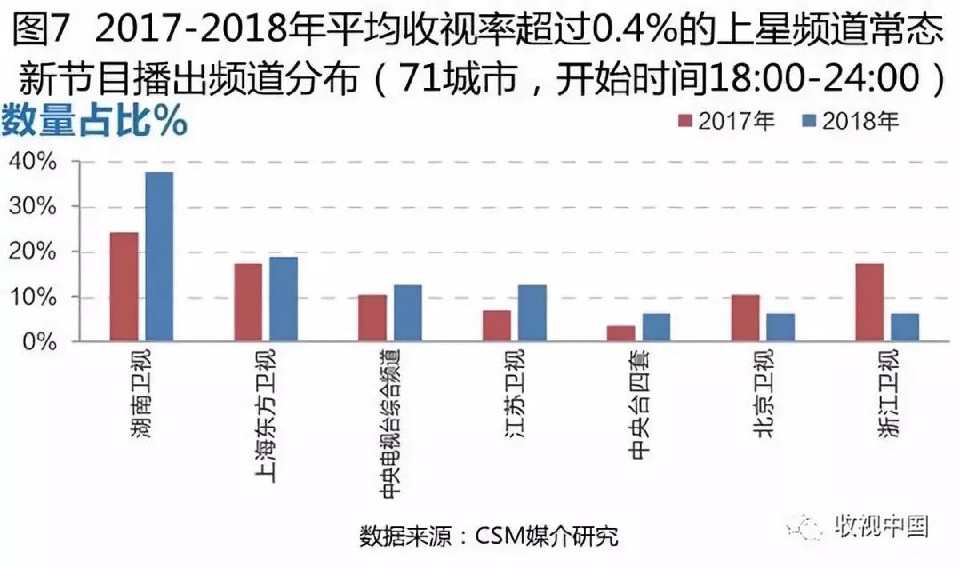 从新节目的播出平台来看,高收视常态新节目有进一步向头部卫视集中的趋势。2018年,平均收视率超过0.4%的常态新节目,进一步集中于湖南卫视、上海东方卫视和中央电视台综合频道等头部上星频道,三个频道播出的高收视新节目占所有上星频道的近七成,其中湖南卫视更是一个频道占据了近四成的高收视新节目,集中度较2017年明显提升(图7)。