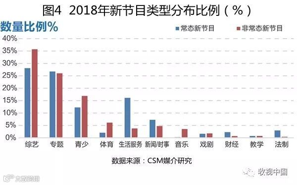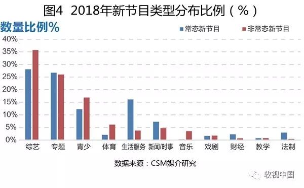 沿袭多年以来的创新特点,综艺、专题和青少是各级频道电视节目创新最为集中的三大领域,其中综艺节目更是绝对的优势成为电视节目创新的最热点类型,2018年在常态新节目中占比达到28%,在非常态新节目中占比达36%。专题和青少节目近年来在电视节目去娱乐化政策引导之下也迎来新的发展,成为综艺节目之外的热点创新领域。2018年是体育大年,世界杯、亚运会等大型赛事相继登场,体育类节目的创新较往年活跃,尤其是非常态体育节目的创新量飙升。生活服务类节目,由于其特殊的服务性、贴近性,在常态新节目中的数量占比甚至超越青少节目(图4)。
