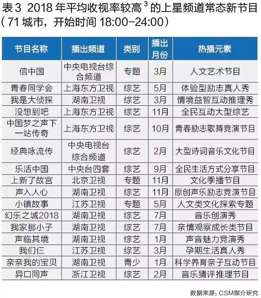 综观2018年上星频道晚间时段收视表现突出的常态新节目,我们可以发现以文化、音乐和体验观察为主题或表现形式的节目在高收视新节目中更为集中,成为节目创新中的收视引领。中央电视台综合频道《信中国》《经典咏流传》、北京卫视《上新了故宫》、江苏卫视《小镇故事》,将文化和经典的传承与创新融为一体,引发观众驻足。湖南卫视《声入人心》《幻乐之城2018》、浙江卫视《异口同声》则在音乐类节目的跨界创新与融合中探索出了一条全新路径,为这一经典节目类型焕发新生不断探索。此外,以上海东方卫视《青春同学会》、湖南卫视《我家那小子》、江苏卫视《我们仨》为代表的体验观察类节目,则成为竞技综艺、选秀综艺之后的另外一种创新模式,在拉近与观众距离的同时,也充分引发了观众共鸣(表3)。