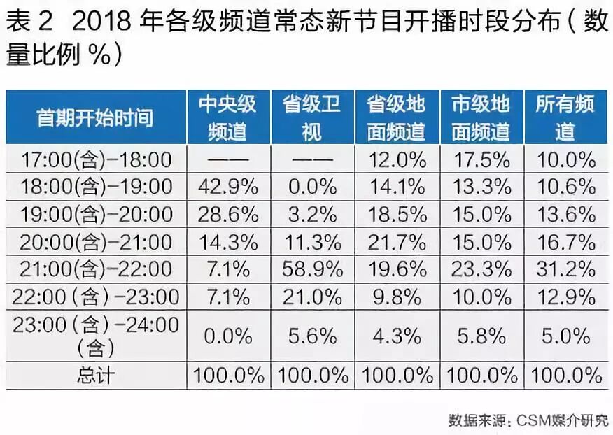根据CSM媒介研究近年来对新节目播出规律的持续追踪,各级电视频道推出的常态新节目有向后黄金时段不断集中的趋势,其中21:00-22:00之间开播的新节目数量占比最高。2013年所有频道中开始时间在21:00-22:00之间的常态新节目数量占比为23.0%;2014年这一数值上升至25.0%;2015年以来,在广电新政的影响下,新节目向这一时段集中的趋势稳定,开播于21:00-22:00之间的新节目占比基本保持在29%左右(2015年29.9%,2016年29.1%,2017年28.8%),2018年,这种集中趋势进一步加剧,开播于这一小时间的新节目比例突破30%大关,达到31.2%。