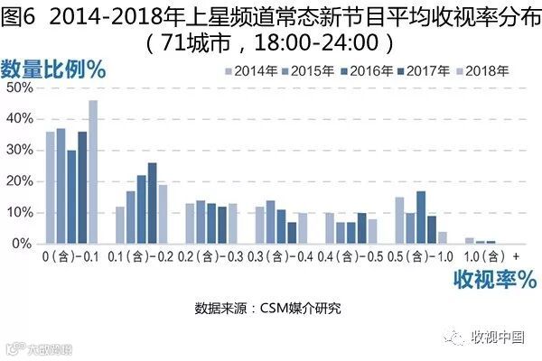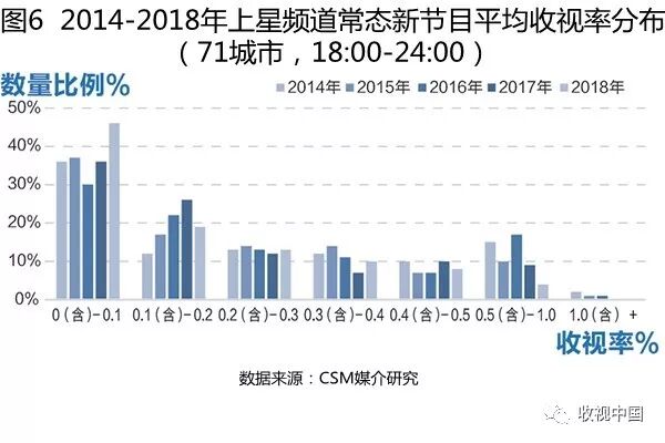 尽管近年来各级频道电视节目创新都朝着更为理性的方向发展,常态节目创新数量回落,但在传统媒体整体竞争力难抑颓势的大背景下,常态新节目的吸睛能力也并不乐观。综观2014-2018年晚间时段上星频道常态新节目的平均收视水平,高收视新节目占比呈现下降趋势,尤其近三年更为明显;平均收视率在0.5%及以上的常态新节目占比由2014年的17%降至2018年的4%,年均降幅在3个百分点以上;平均收视率达到1%以上的“现象级”新节目更是在近两年缺位。与此同时,收视率在0.2%以下的新节目占比增长,由2014年的48%增至2018年的65%,更多的新节目收视在低位徘徊(图6)。