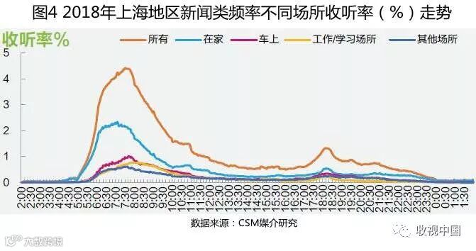 上海市场广播收听量主要集中在家里和车上,在家收听贡献主要来源于新闻类广播频率,是全天收听的主要力量,特别是早间06:00-09:00时段收听效果突出,收听峰值超过2%,远远高于其他场所(图4)。