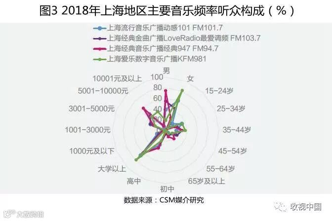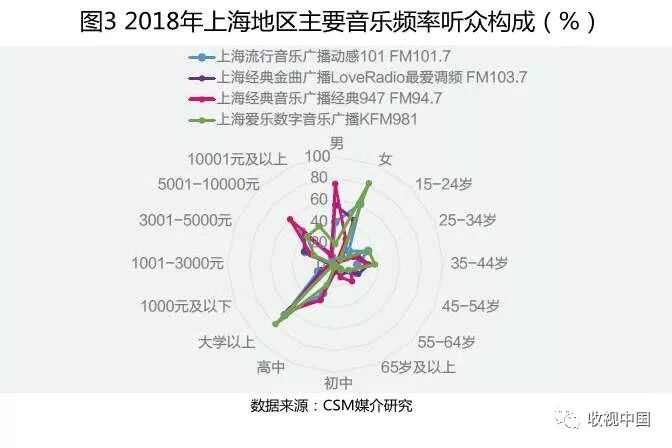 细分各频率,上海地区音乐类频率以不同的频率定位吸引不同年龄不同背景的受众层。上海流行音乐广播动感101 FM101.7主要针对15-34岁年轻听众,具有非常专业、纯粹的音乐节目流,支撑其全天侯音乐电台的前沿地位。上海经典金曲广播LoveRadio最爱调频FM103.7主要针对35-54岁中青年听众,频率一直努力倡导优质慢生活,引领都市人在必要的财富积累下,开始追求生活及精神层面的享受。上海经典音乐广播经典947 FM94.7内容以古典音乐为主,辅之以中国和欧美老歌、轻音乐、跨界音乐以及民乐,从曲风上填补上海地区音乐类频率的收听需求,同时吸引一批高学历高收入人群。上海爱乐数字音乐广播KFM981作为中英双语欧美流行音乐电台,女性、大学及以上学历、个人月收入1万元及以上听众比例最高,致力于向年轻人推广及感受全球潮流文化。