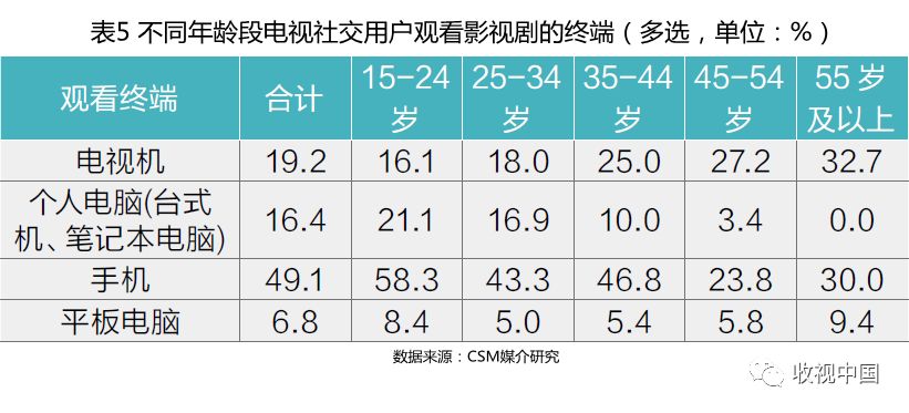 在综艺节目和影视剧两个电视社交用户最愿意参与讨论的节目类型中,移动收视特征非常明显,通过手机端收看并发表看法的比例都接近50%。在45岁以下人群中,手机观看终端的比例远高于电视机、个人电脑和平板电脑。45岁以上人群中,电视机和手机两个终端的比例相对接近(表4、5)。
