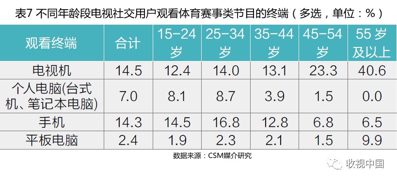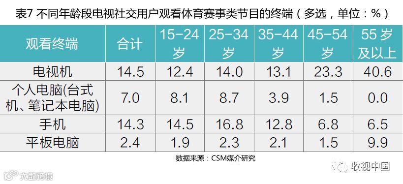 对于社交平台上讨论的体育赛事节目的收视终端,电视机和手机和比例都略低于15%。由于体育赛事在大屏幕上具有更好的观赏性,因此通过手机收看体育节目的用户比例明显低于综艺、影视剧和新闻类节目。在45岁以下人群中,电视机和手机的比例相差不大,而45岁以上人群更多选择电视机作为收视终端(表7)。