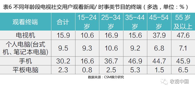 对于社交平台上讨论的新闻/时事类节目的收视终端,手机的比例在30%左右,电视机比例在15.9%,两比例都低于影视剧和综艺节目。但45岁以上人群通过电视机和手机终端收看电视新闻节目并发表看法的比例高于影视剧和综艺节目。而15-24岁等年轻人群对新闻类型电视节目的收视后评论意愿在各观看终端都较低(表6)。