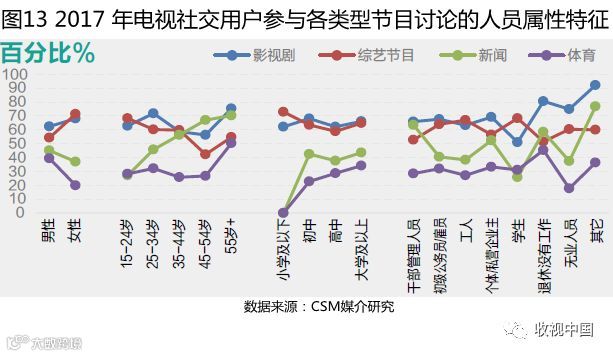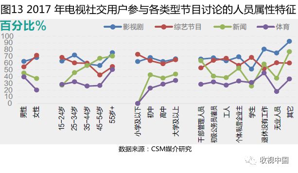 细分各个节目类型的人员属性,影视剧在各属性人群中差异性相对较小,只在学生人群中数值相对较低。综艺节目则有更多女性用户愿意参与讨论,包括学生、白领在内的年轻人群中也参与度也较高。新闻时事节目则在男性、中老年、干部管理人员和个体私营企业主等人群中比例较高。体育赛事节目则吸引了更多男性、中高学历人群在社交媒体参与讨论(图13)。